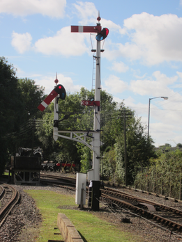 Figure 2: Photo of typical railway semaphore signals at the Great Western Society site at Didcot, Oxfordshire, UK. The signal on the right displays a stop command, while the one on the left displays 'proceed’ for the diverging route on the left. Photo: Author.