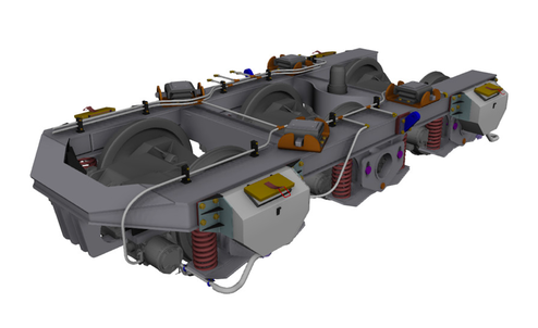 Figure 12: A 3-axle bogie drawn using CAD. The function of a 3-axle bogie is the same as a 2-axle bogie but the additional axle is needed to distribute a larger mass over the track. The weight limits for track are defined as axle weight, i.e. the weight allowed to be carried on each axle. The maximum axle weight for main lines in the UK is 25 tonnes, in Europe 22.5 tonnes. On heavy haul freight routes it can be up to 36 tons. The disadvantage of the 3-axle bogie is the long rigid wheelbase, which limits the curve radius that can be used. Drawing: 3dcadbrowser.com.