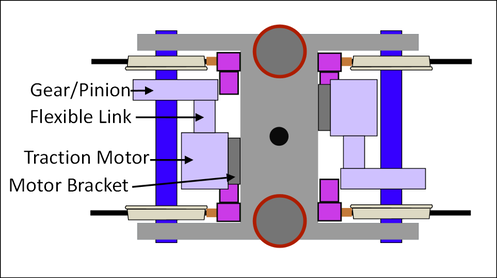 Figure 9: A bogie with a welded H-form frame equipped with two electric motors mounted in the “frame mounted” configuration where the motor mass is largely carried by the bogie frame. Drawing: Author.