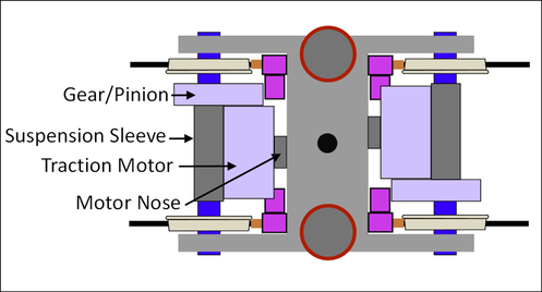 Many motors are suspended between the transverse member of the bogie frame called the transom and the axle. This motor is called "nose suspended" because it is hung between the suspension tube and a single mounting on the bogie transom called the nose.